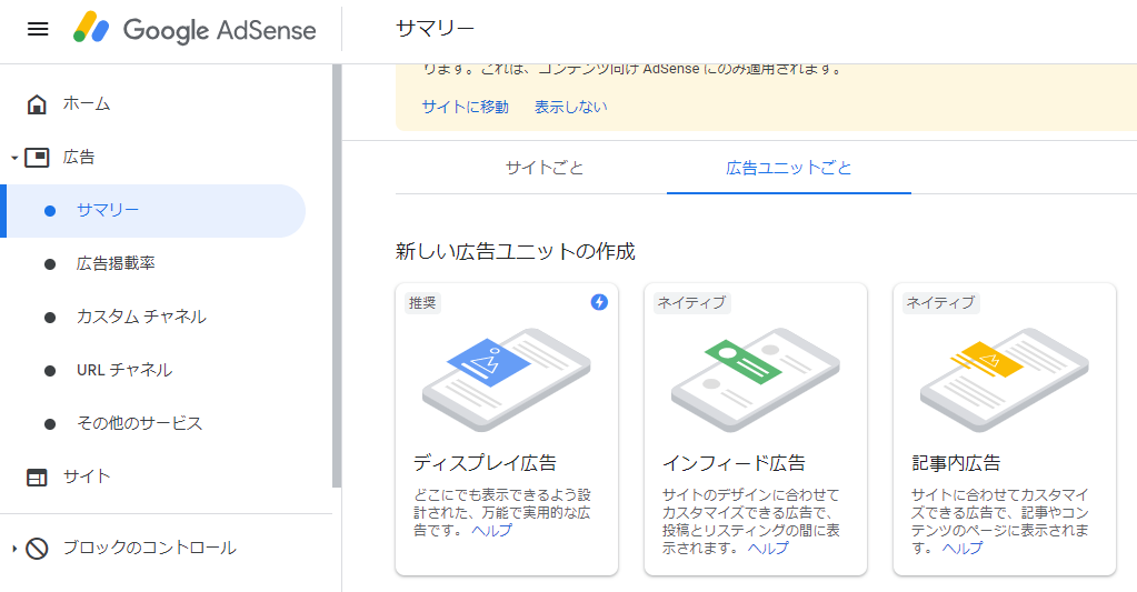 「広告」をクリックすると上図のような画面が表示されます。「広告ユニットごと」を選択し、「インフィード広告」を選択します。