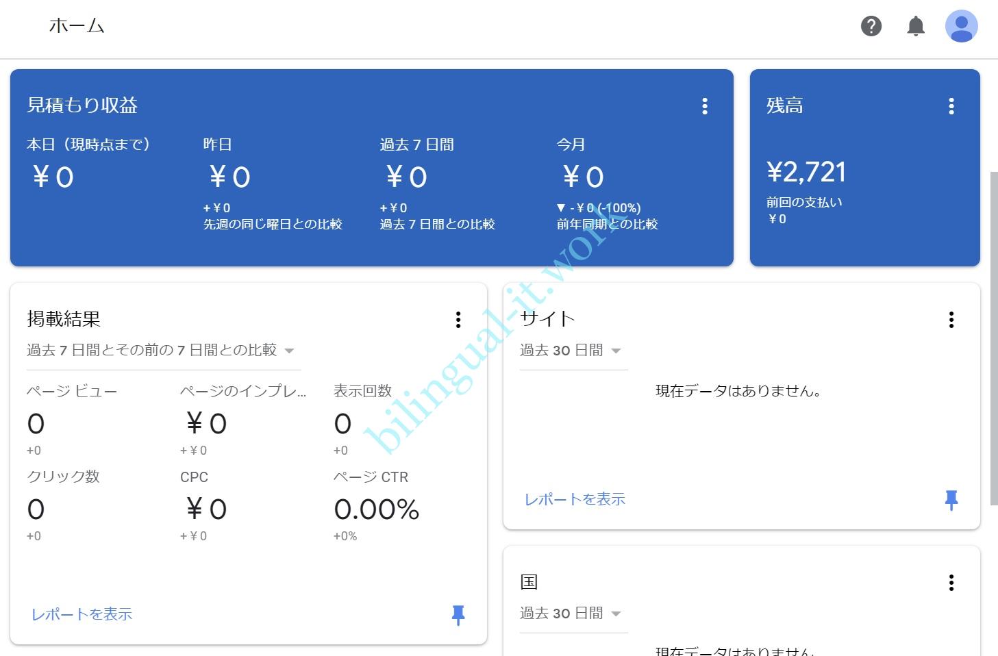 残高の2,721円は昔やってた頃のものです。厳密に言うと、まだ適用サイトは1つなので将来的には残高マイナスこの金額が当サイトの成績と言えるでしょう。