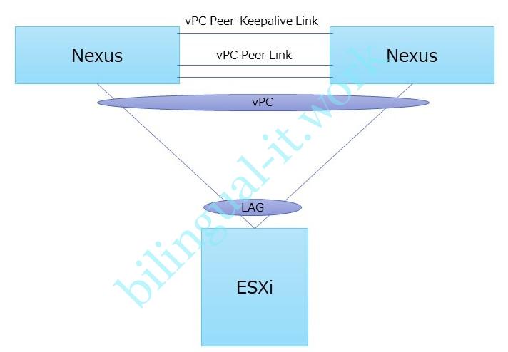 ESXサーバ側ではアップリンクでLAGを組み、Nexus2台に接続し、Nexus側ではvPCを組みます。