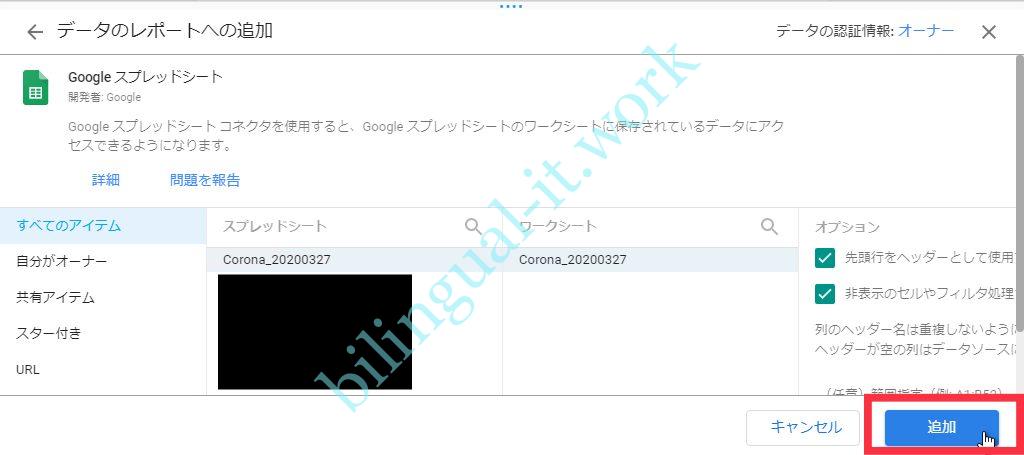 スプレッドシートを取り込むオプションは必要に応じて設定します。今回はそのまま「追加」をクリックします。