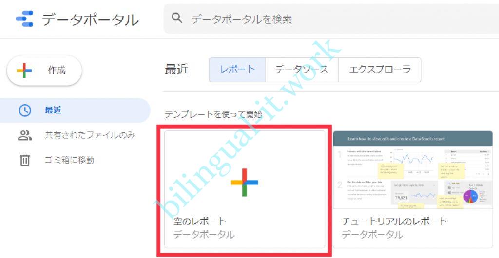 次にいよいよ、Google Data Portalにアクセスします。「空のレポート」をクリックします。