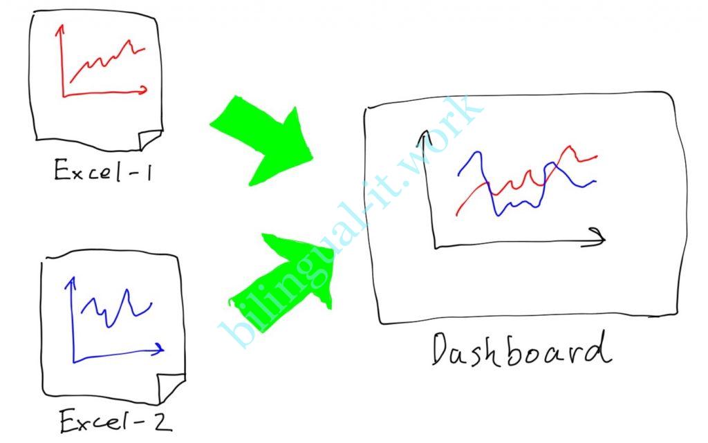 データの元は当然Excelファイルとは限りません。ダッシュボードは複数の情報源からデータを集めて可視化するものと覚えておけば良いでしょう。