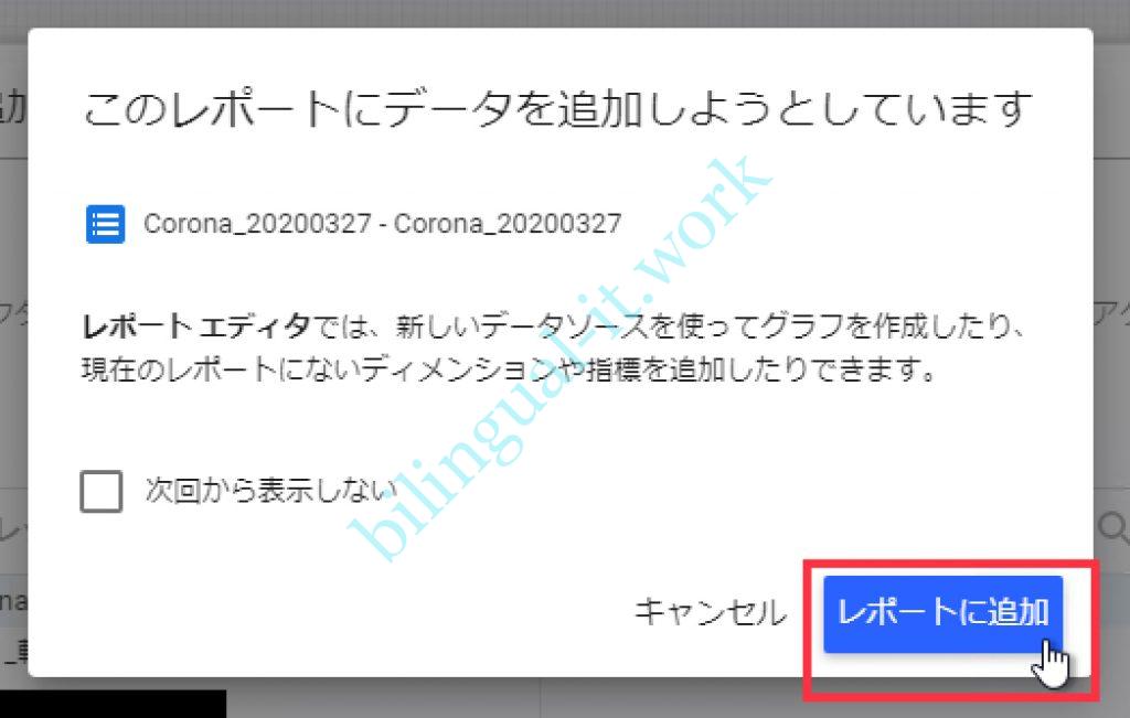 「このレポートにデータを追加しようとしています」と、ファイルを追加する旨の確認が行われます。ファイルに間違いがない場合には「レポートに追加」をクリックします。