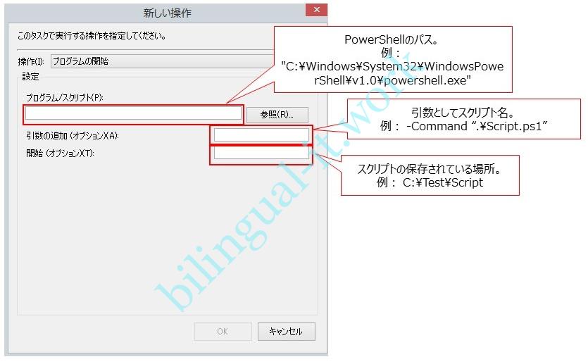 そして引数として「-Command “スクリプトのパス”」を入力します。