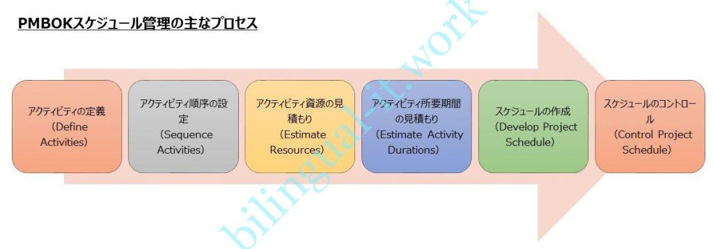 PMBOKの10ある知識エリアの1つであるスケジュール管理では、主に下記のプロセスから成り立っています。
