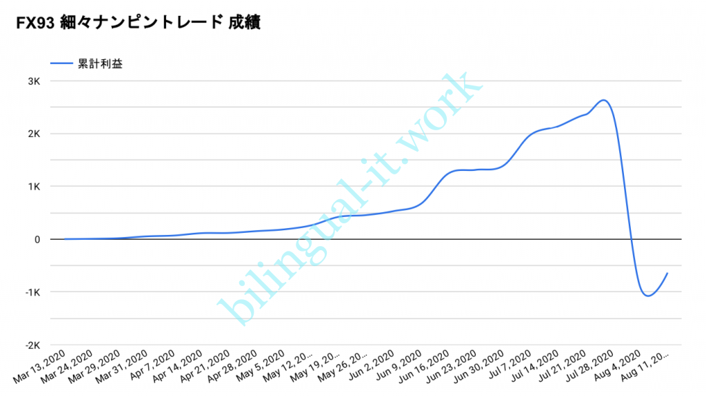 8月11日のレポートです。以前までは利益継続中のFXトレード戦略だ!のようなことを言っていたのですが、先々週に操作ミスによるロストカットが発生した関係で累計の利益としてはマイナスとなっております。