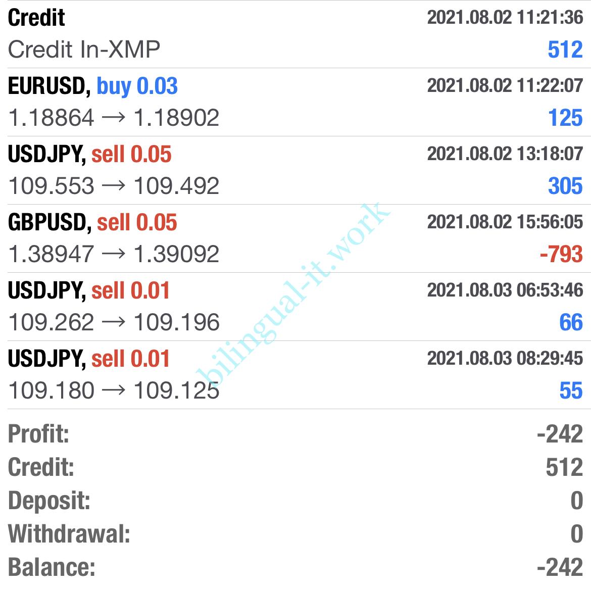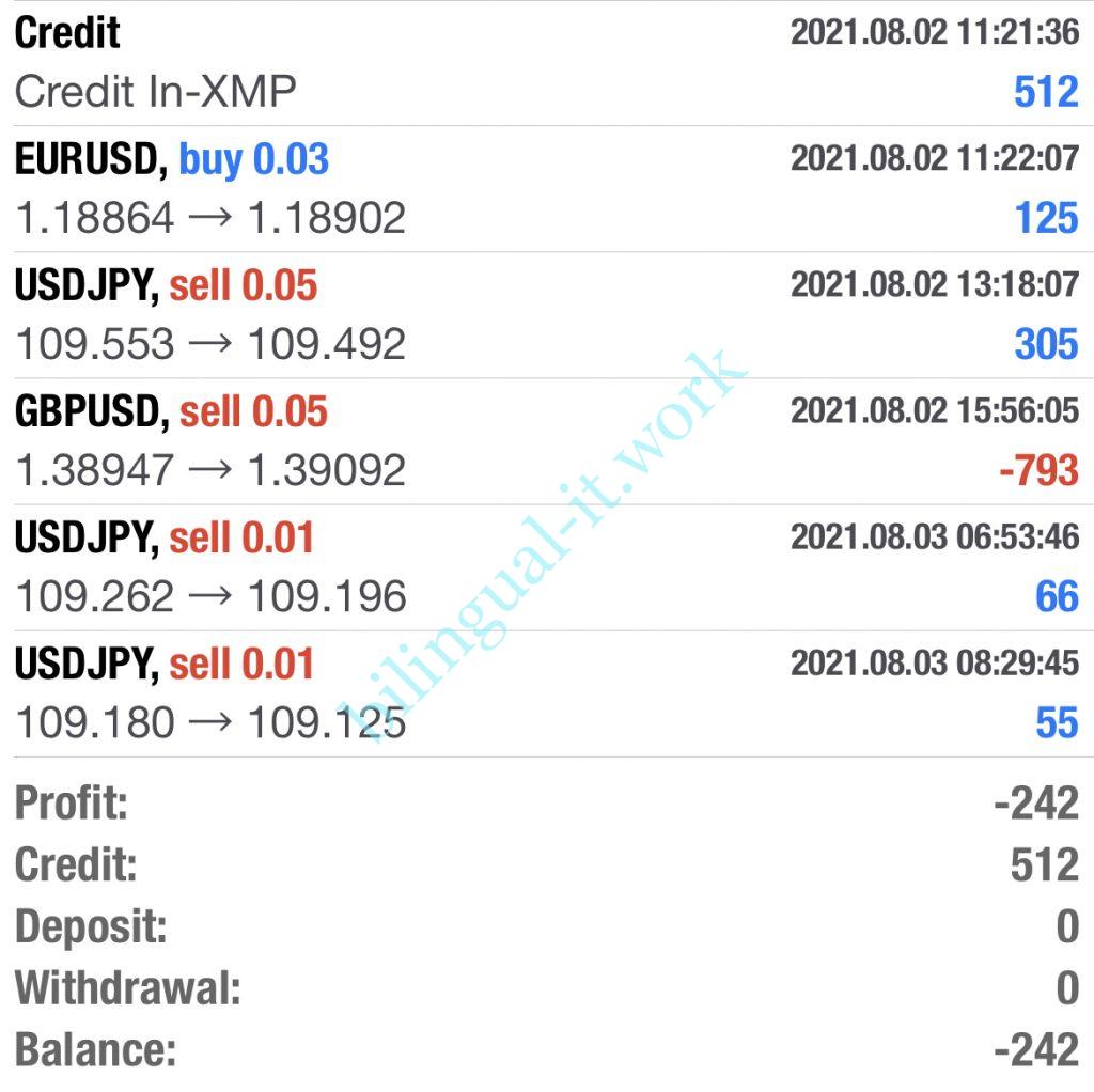 上図の通りまずは512円分のクレジットが入りました。その後430円ほどの利益を得ましたが、寝ている間に800円近いロスカットとなってしまいました。