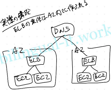- AZ-AとAZ-Bに跨るELBを作成しようとすると、共通で使われるDNSが作成される。ELBの実体はAZ-AとAZ-Bにそれぞれ存在し、ELBを経由するアクセスについては、DNSで名前解決されたELBのIPアドレスによって振り分けられる。