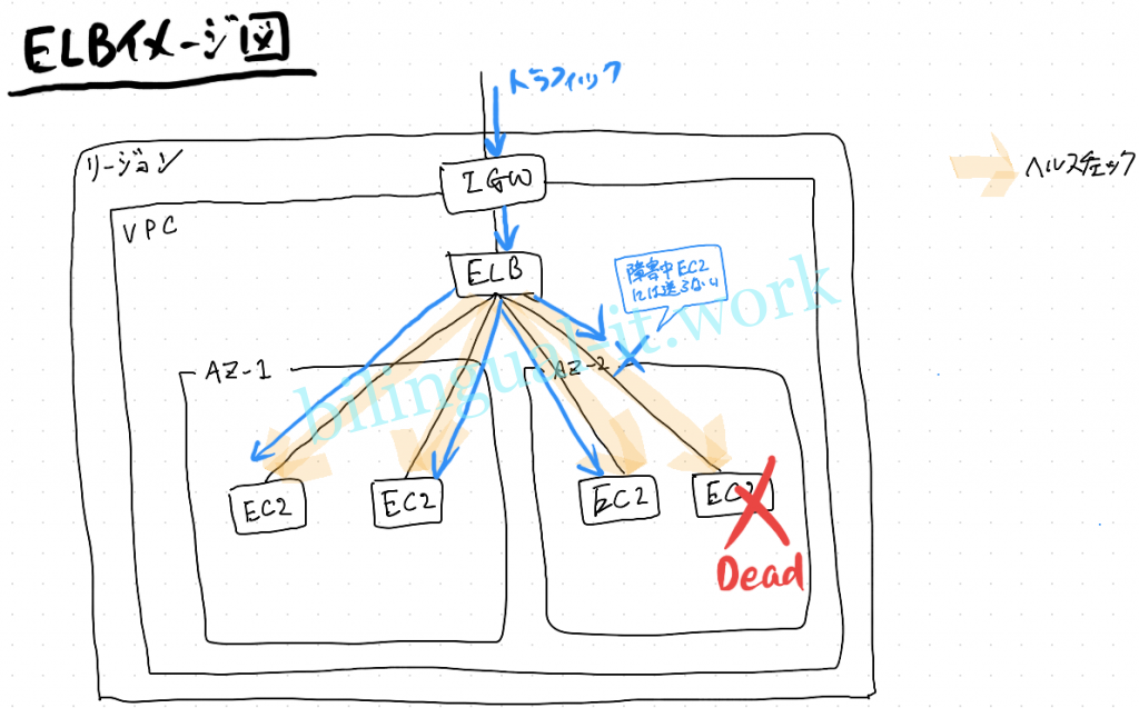 - マネージド型の負荷分散サービスであり、受信トラフィックを配下の複数のEC2に分散する。