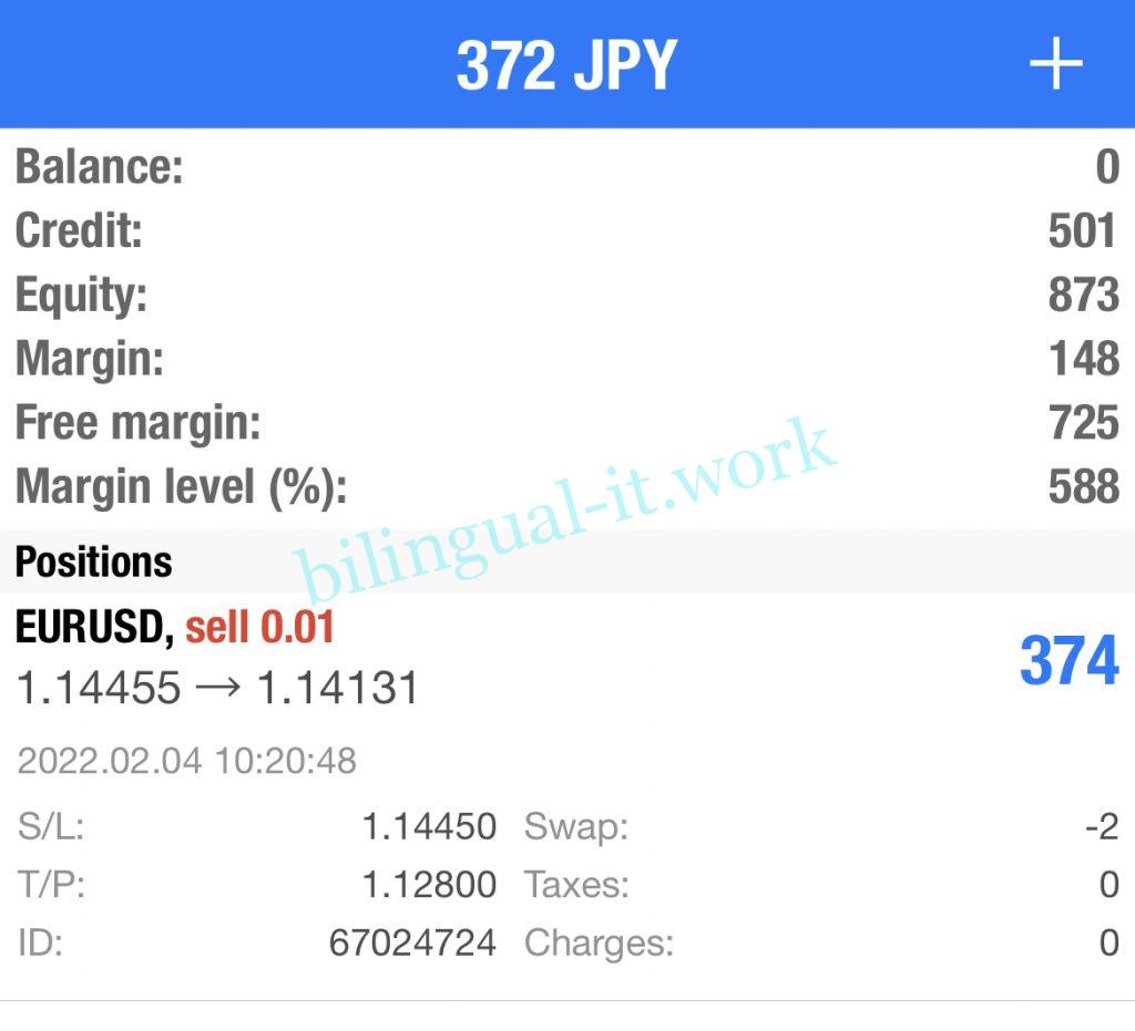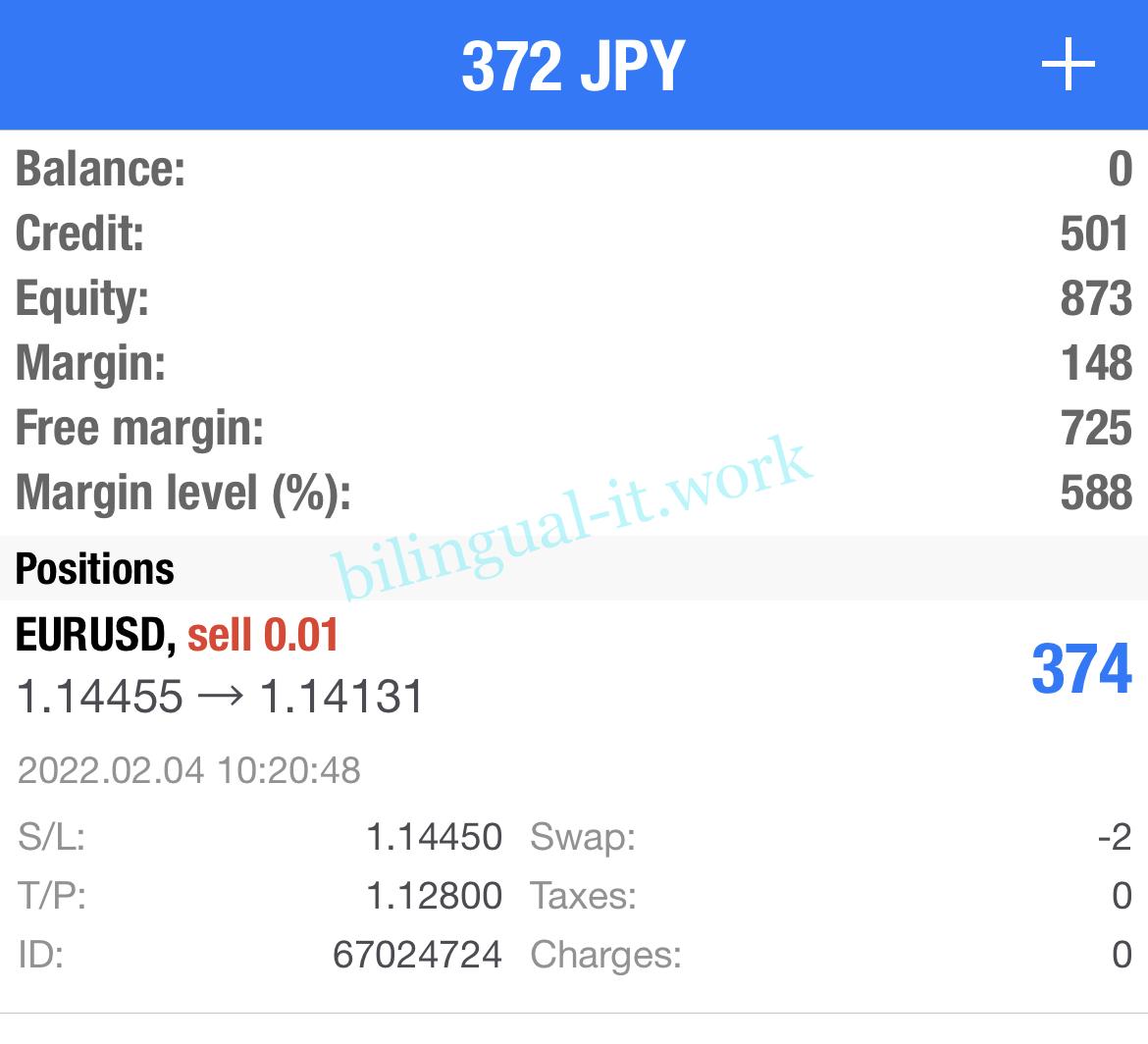 取引開始する数日前にぐんと値が上がっていたので、ショートで逆張りしました。証拠金はXMTradingのロイヤリティポイントというものを消費して得たクレジットを使っているので、万が一負けても金銭的ダメージは一切ないからです。