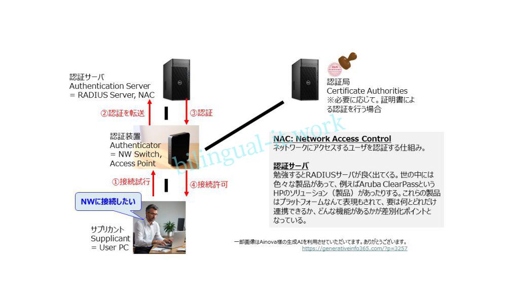 NACではネットワークに接続しようとするユーザを認証するためのもので、IEEE 802.1Xのフレームワークにおける認証サーバと理解しています。