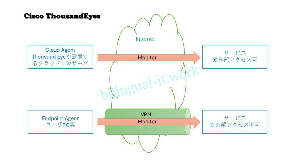 と、思いっきり脱線してしまいましたが、Cisco ThousandEyesとはクラウドもしくはエンドポイント端末から色々監視するサービスです。