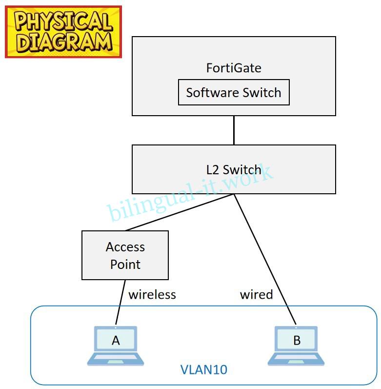 FortiGateと言っても、無線と有線では論理的にインターフェースが異なりますので、内部に論理的なスイッチ(Software Switch)を持つこととなります。