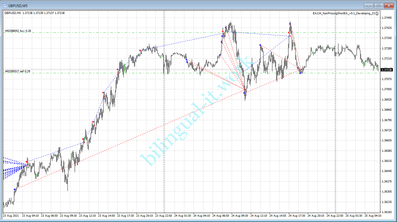 青線はロングポジションで、赤線がショートポジションです。ナンピンをしているので、損失決済となるポジションも存在しますが、他のポジションが利益決済されるため、相殺され、結果的に利益となります。