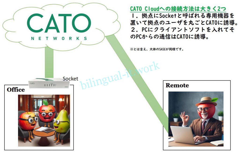 もう1つの方法は、ユーザのPCにクライアントソフトを入れることでCATOに接続できます。外出先のネットワークからもCATOに接続できます。コロナ渦によるリモートワークへのシフトと、ゼロトラスト(≒SASE)の導入が広まる中で良く採用されるようになったと(個人的には)思っています。
